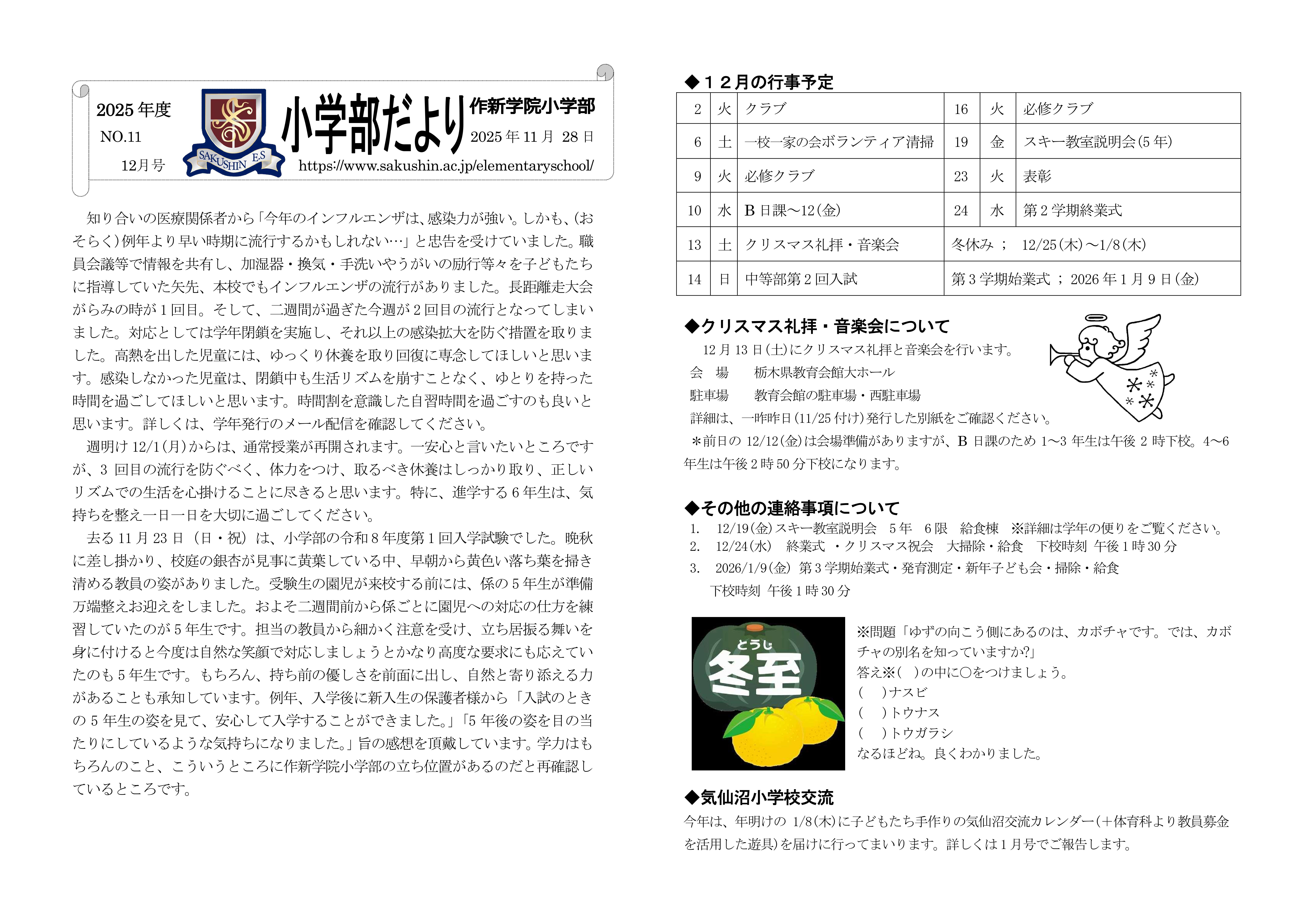クリスマス礼拝・音楽会のお知らせ 今年度のクリスマス礼拝・音楽会を下記の日程で行います。牧師による聖書のお話とキャンドルサービス,各学年の児童による合奏など,厳かな礼拝と学年ごとに趣向をこらした演奏をどうぞお楽しみください。 【日時】令和7年12月13 ...