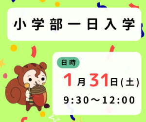 小学部の一日入学を1月31日(土)に行います。来年度新入生のみなさん,保護者の皆様の来校をお待ちしています。 【日時】令和8年1月31日(土) 9:30~(受付9:00~) ・小学部児童玄関で受付をお願いいたします。 ...