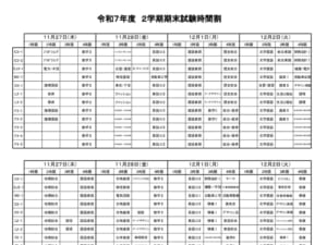 11月27日(木)・28日(金)・12月1日(月)・2日(火)に 第2学期期末試験が行われます。 時間割を掲載しました。 PDFファイル(下記のダウンロードファイル)において、実施日の曜日に誤りがございまし ...