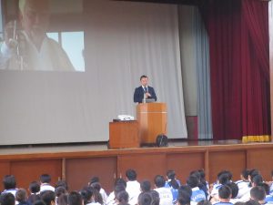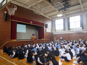 中等 10月MD(モーニングディボーション)の風景 投稿日:2019年10月15日 10月15日(火)1時間目、小中体育館2階にて、安食牧師からの聖話が行われた。今月のテーマは「良心」でした。「良心とは、何が良いことで何が悪いことかわかる心、正義を求める心」と定義して、事例や聖書の言葉を引用して、お話をいただいた。常に自分自身の良心に問いかけて、善い行いが出来る人になってほしいと思います。 【聖話の様子】