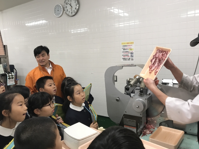 お肉売り場の裏側では,店員さんたちが新鮮なお肉をパックに詰めて商品にしていました。大きなお肉のかたまりを機械に入れると,あっという間にスライスされて,驚きました。