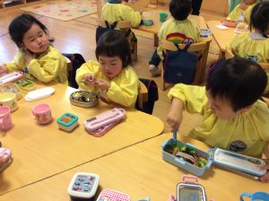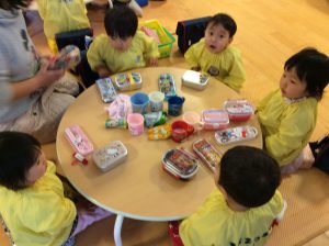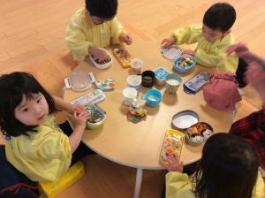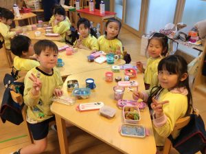 青組さんにとってはこうしてみんなでお弁当を食べるのもあとわずか。お家の方の愛情たっぷり弁当で楽しいランチタイムを過ごしました。