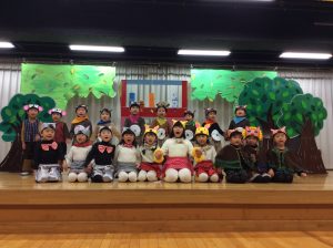 午後の部の年中組は緑2組。昔話でお馴染みの「おむすびころりん」おむすびを穴に落としたおじいさんとネズミ達の交流を歌とセリフで見事に演じました。