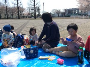 幼稚園では春休みも預かり保育「ぽかぽか」を実施していますのが、今日はお天気も良いしみんなで桜の下でお弁当を食べることにしました。