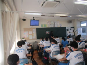 9月9日(水)1時間目に森田教諭の英語研究授業が3年生教室で行われました。コロナ対策のため、出入り口や窓を開け、サーキュレーター2台を稼働して換気を徹底して授業を展開しました。生徒たちは皆マスク着用でのリーデイングでしたので、大きな声を意識してゆっくりと発音していました。本来はグループ形式で教科書の文をリピートする活動が入るところですが、隣との対面での活動となっていました。様々な制約の下での授業展開でしたが、生徒たちは自分のペースで授業内容に集中している様子でした。授業でインプットした内容は、どこかでアウトプットして記憶にとどめる工夫を加えてほしいと思います。