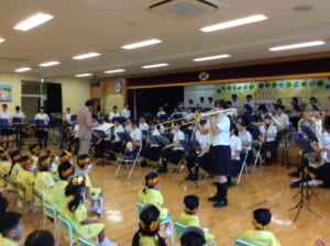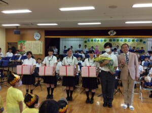 9月生まれの年長組のお友達から吹奏楽部のお兄さん、お姉さんにお礼の花束とプレゼントが渡されました。
