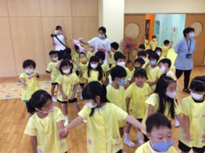今日の幼稚園は音楽の秋です。作新学院高校の吹奏楽部のお兄さん、お姉さんが幼稚園に演奏に来てくれました。吹奏楽部は新型コロナ感染で学校が休校になってしまった時、いち早くリモートで演奏をコラボして、話題になりました。本当は6月の予定だったのが、新型コロナウイルス感染予防のため延期になっていました。ついに実現して、みんな大喜び。