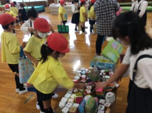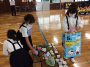 お店屋さんの準備が出来ました。お買い物チケットの入った手作りバッグをもらって、いよいよ始まりです。