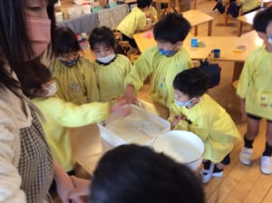 幼稚園では毎年12月に本格的な臼と杵を使って、伝統行事の餅つきを行っています。いつもの年は搗いたお餅をあんこやきな粉、海苔で味付けして食べていたのですが、新型コロナウイルス感染の影響で、去年と今年はついた餅は食べずに鏡餅にしました。今年の青組さんは一人一つずつ鏡餅を作ってみました。