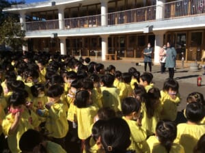 子供たちは教えられたように、ハンカチで口と鼻を押さえて園庭に避難します。