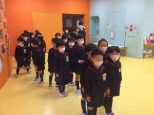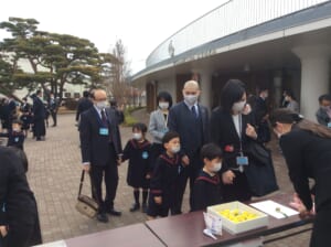 卒園式当日の朝、春らしい穏やかな陽気になりました。保護者と一緒に受け付けをする卒園児たち。