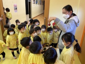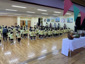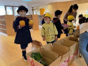 協力して頂いた野菜、果物と年中組の子ども達が作ったガーランドを3箇所の施設にお届けしたところ、とても喜んでいただけました。