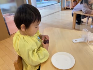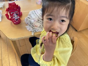 美味しそうに出来上がりました。ぴよぴよ組では初めて食べる子もいたようです。では、いただきます。