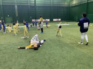 今日来てくれた選手の自己紹介。ご挨拶をしたら、ウォーミングアップに鬼ごっこです。捕まえられるかな?