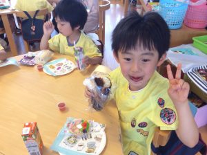 パン屋さんごっこは縦割りの交流や、お買い物体験を通して、コミュニケーション能力や人間関係を育むことができます。自分で選んで買ったパンを美味しそうに食べる様子を見ると、食は何よりも楽しいことが1番と感じます。