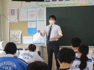 6月15日(木)3時間目、2年4組にて数学の教育実習生研究授業が行われました。2年生の数学で、これから数学が好きになるかならないかの境目の単元となる「一次関数」の授業が展開されました。関数のグラフを黒板に貼り、一次関数の式を求めるための傾きや切片の考え方を、導入として丁寧に説明していました。生徒とのやり取りや机間巡視で、生徒一人一人の理解度合いを把握してから、問題演習に入っていきました。子供たちはしっかりと板書しながら、説明を聴き問題演習に取り組んでいました。疑問点があれば、後でもよいのでしっかり解決しておくことが大事な単元ですので、多くの問題演習に取り組んでほしいと思います。基本をしっかり押さえた良い研究授業であったと思います。