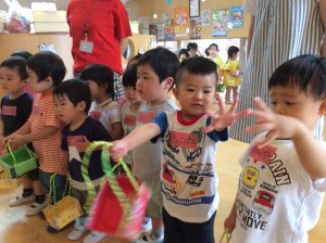 小さい組のお友達がやって来ました。まだ自分で欲しいパンをいえないので、胸に欲しいパンは何かのシールを付けています。それを見てパン屋さんが連れて行ってあげます。