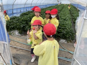 毎年恒例のいちご狩り体験に年長組さんが行って来ました。年中組さんの時にも行っている子がほとんどなので、1年ぶりになります。園バスに乗っていつもお世話になっている篠崎いちご園に出発。