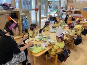 ぴよぴよ組、ひよこ組。ひよこ組は「こわ かわいい」お面をつけて食べました。