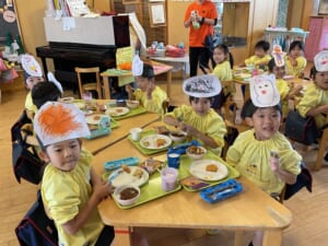 年少組さんはクラスをシャッフルして、テラスで全員で食べました。日差しが注いで気持ち良さそうでした。お祈りもしっかりできるようになりました。