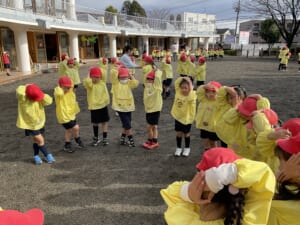 まずは園庭で体操。年中組の選んだ体操は「ギョギョギョギョーザ」と「もったいない体操」どちらも青組さんが外部で披露した体操です。青組さんへの憧れを感じますね。