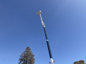 このハシゴ車はビルの9階まで届くのだそう。代表の先生が乗り込みました。がんばれ〜!の声援が子ども達からかかりました。ぐんぐん上がって行くハシゴ車を見守ります。