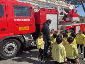 幼稚園で避難訓練が行われました。空気が乾燥して、1番火事の多いこの時期、火災を想定した避難訓練です。1学期は雨でDVDの鑑賞になってしまったのですが、今日は宇都宮西消防署からたくさんの消防車とハシゴ車が来てくれて子ども達は大興奮でした。