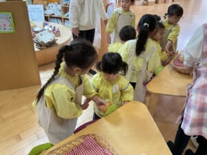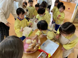 小さいクラスの子には手をつないであげたり、袋を開けてパンを入れやすくしてあげたり年中組もこの時期になるとすっかり、お兄さん、お姉さんらしくなりますね。だってもうすぐ青組さんですもんね。