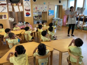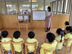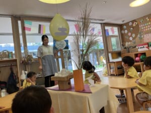 緑組はそれぞれ、担任が選んだ十五夜にちなんだ絵本を読んでもらいました。