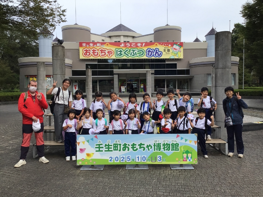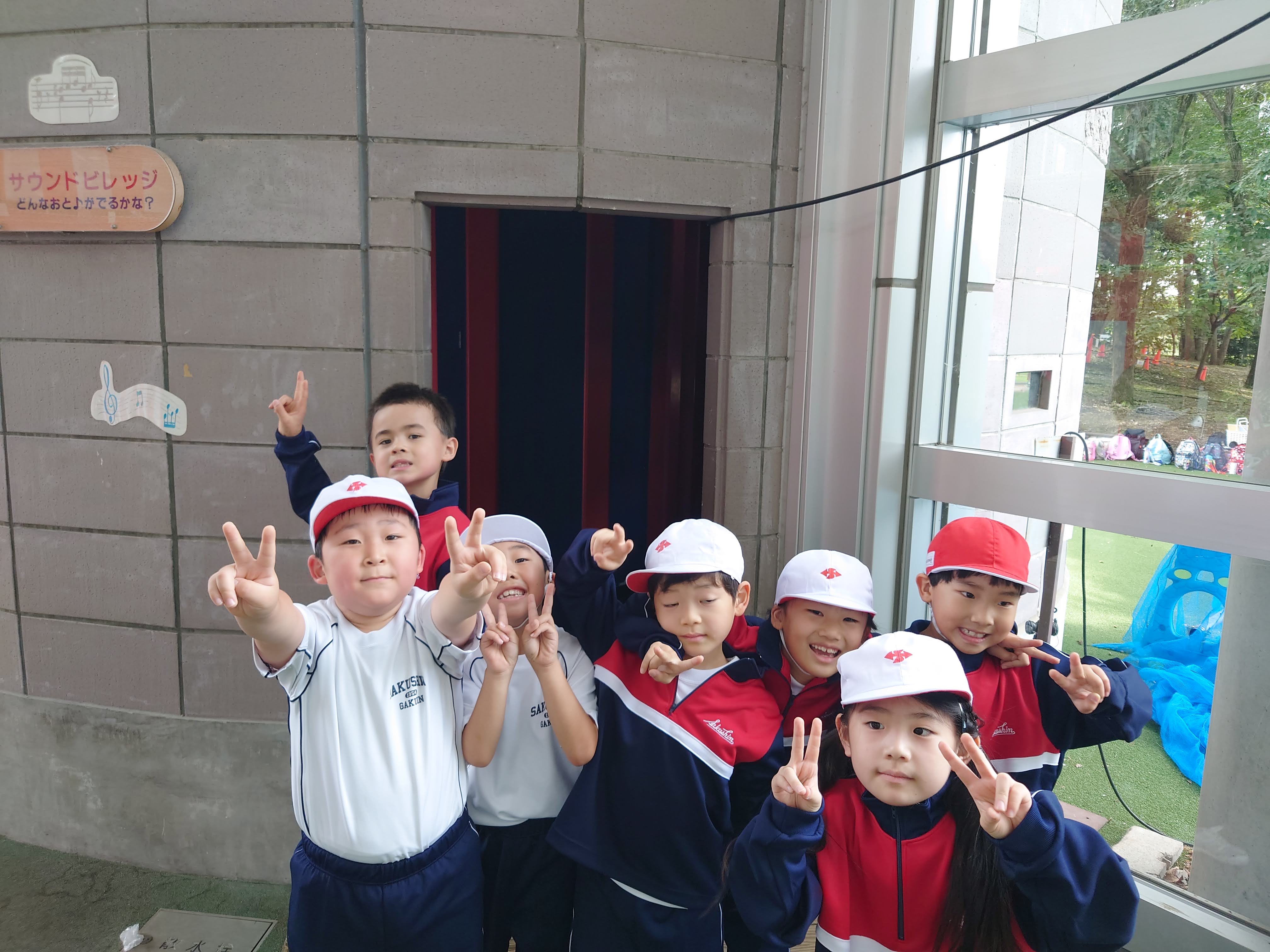 公園の森は、木々が少しずつ色づいています。綺麗な花もたくさん咲いていて、見つけたものを教え合いながら歩きます。まずは『おもちゃ博物館』の前で記念撮影をしました。
