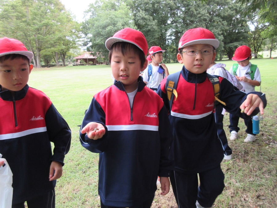 おなかがいっぱいになった子どもたちは、生活の学習の一環として、秋の実り、どんぐり探しをしました。いろいろな大きさや形のどんぐりだけでなく、虫やカナヘビなど小さな動物を見つけることもでき、良い学びになったようです。