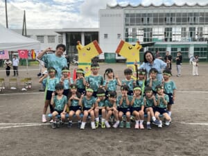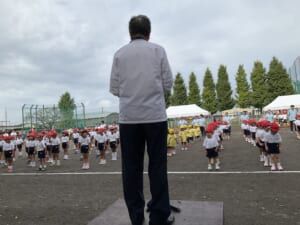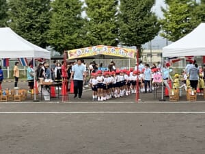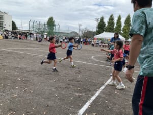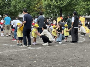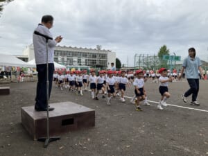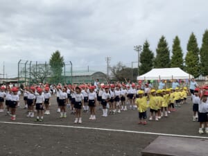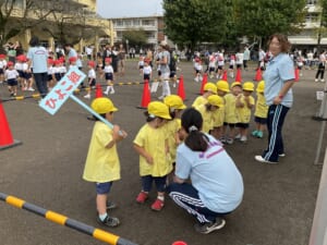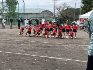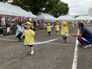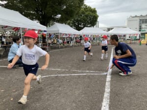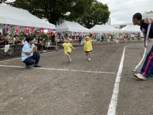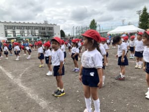 ひよこ組さんは初めての運動会の子も多かったのですが、トラック半周をしっかり駆け切りました。黄色い帽子がひよこ組、赤白帽子が年少組です。