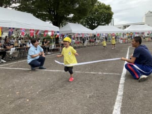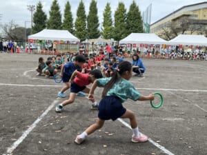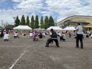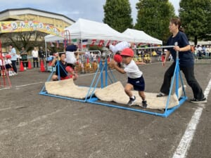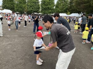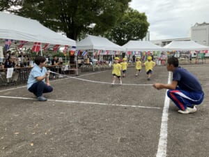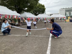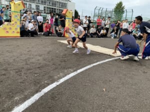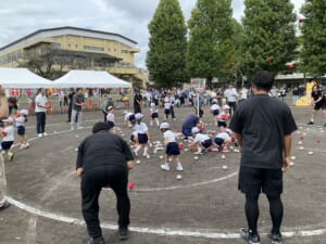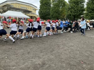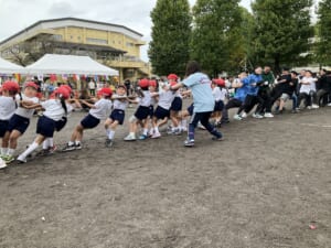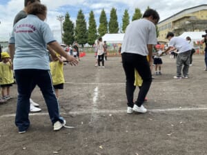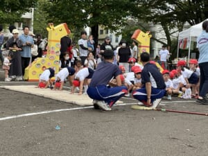 運動会の見どころのひとつ、年長組親子による親子綱引き。お父さんたちの迫力が半端じゃありません。気合いは十分!走りと力の勝負です。