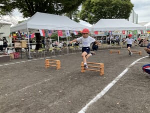 体操教室で習った側転から始まり、はしご潜り、鉄棒、マット、ハードルの障害物をクリアして行きます。