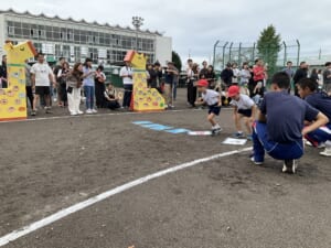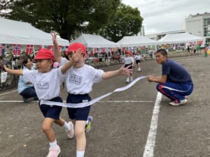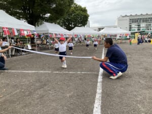 中盤の見どころ、年長組全員がトラック1周を走る、クラス対抗リレー。お泊まり保育で作った絞り染めのTシャツで団結を深めます。