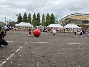自分の体より大きな玉を転がします。折からの風にあおられ、あっち行ったりこっち行ったり、ようやくアンカーにたどりつきました。勝ったのは赤組。