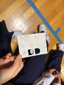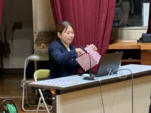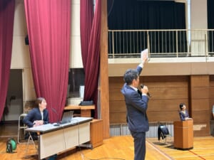 1番から43番までの数字には先生たちの名前が振られていて、榎本さんがビンゴ札を引き川井会長からコールされました。生徒たちは自分のカードに書いた先生の名前が呼ばれると大喜びで盛りあがりました。