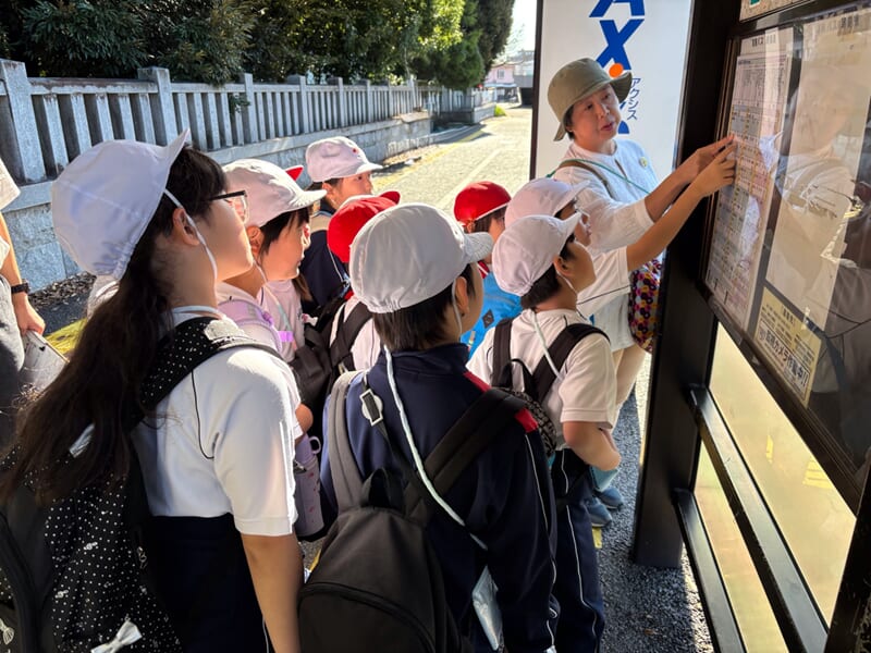 「もうすぐバスが来るかな?」と、時刻表を見て確認していました。
