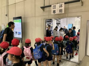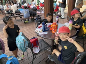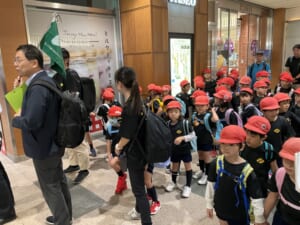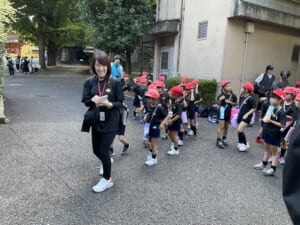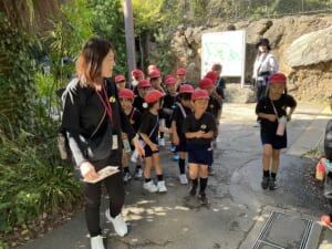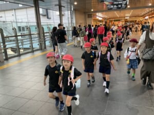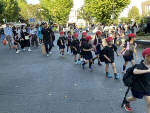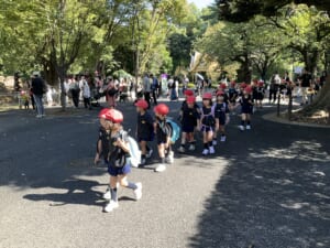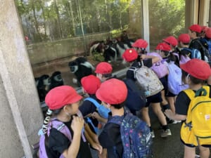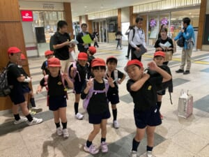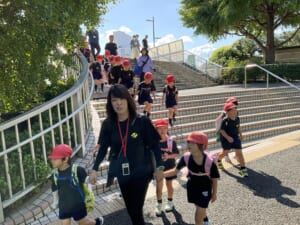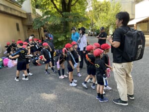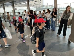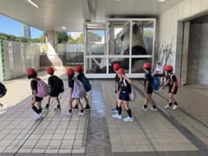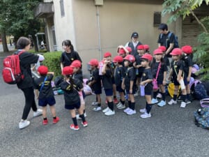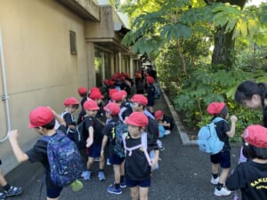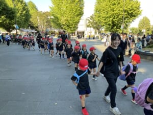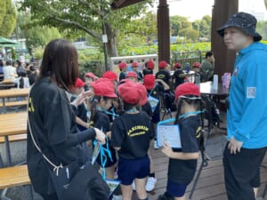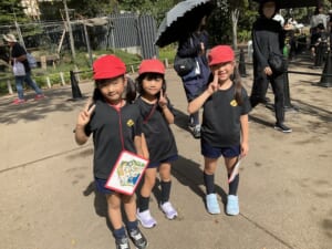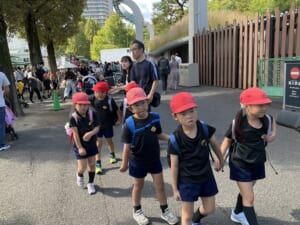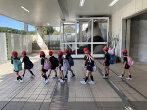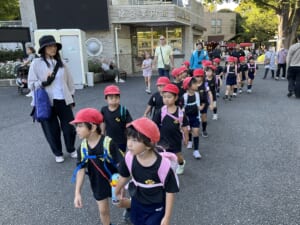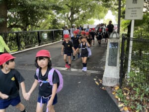 前日の雨が嘘のように、綺麗な青空が広がりました。ピカピカの遠足日和です。朝、お家の方と集合場所に来て、ここでお別れです。
