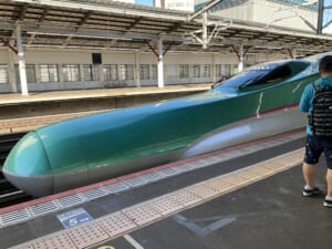 新幹線が入って来ました。駅員のお姉さんがお見送りしてくれました。