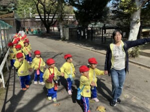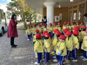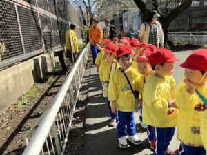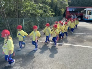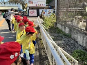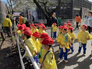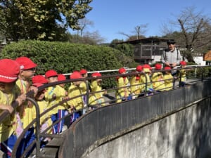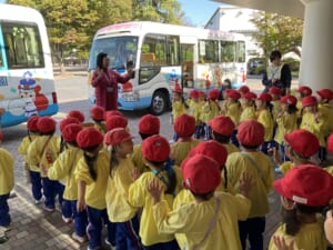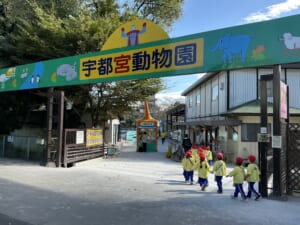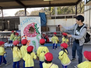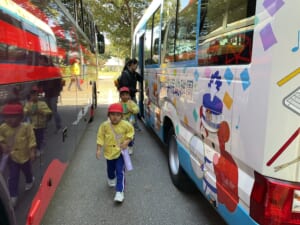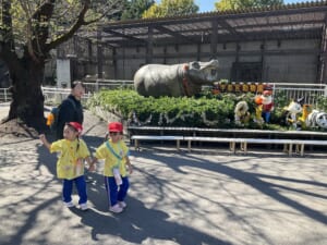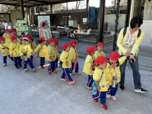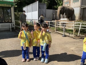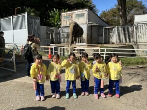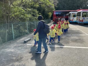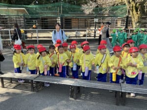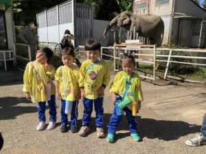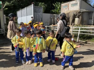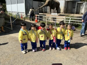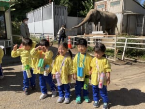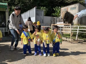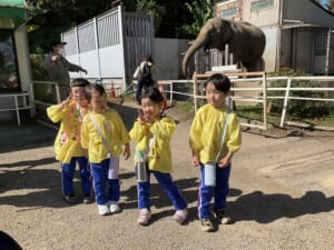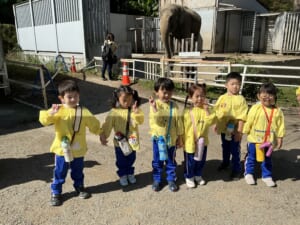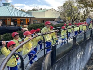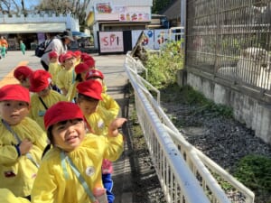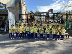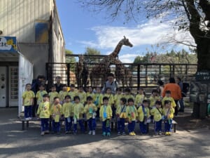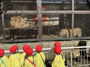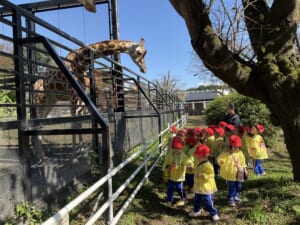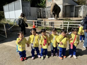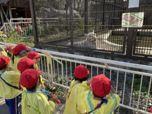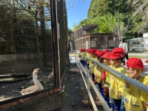 雨で1週間延期になった、年少組の宇都宮動物園の遠足が実施されました。今日は雲ひとつない晴天!ちょっと肌寒い朝でしたが、園長先生に朝のご挨拶をして、自分で作った望遠鏡を下げてバスに乗り込みます。