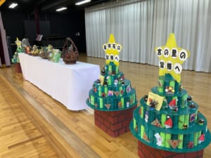ステージには持ち寄った野菜と年中組の作ったツリーが飾られていました。