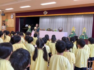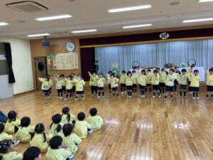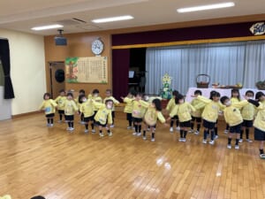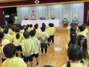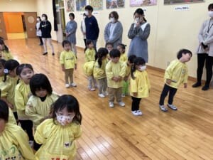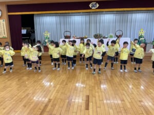 全員で「うれしいかんしゃさい」を歌います。その後、年中組さんが施設訪問のために練習して来た「とんぼのめがね」と「手のひらを太陽に」を振りをつけて披露してくれました。