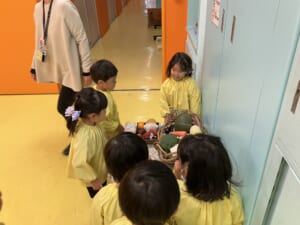 朝、登園して来たら担任の先生に報告して、自分で野菜や果物を箱に入れに来ます。持って来た野菜や果物の名前もきちんと言えていました。