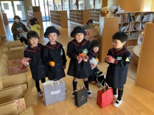 間近でお野菜を見てお部屋で感謝祭についてのお話を聞きました。年中組さんが作ったクリスマスツリーは先生が、3ヶ所の施設にお届けして来ました。とても喜んでくれていました。子供たちが来ないので残念がっていましたが、素敵なクリスマスプレゼントをおじいちゃん、おばあちゃんにお届けできて良かったです。