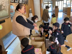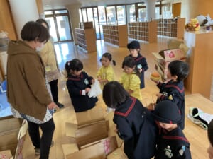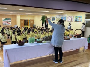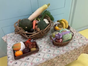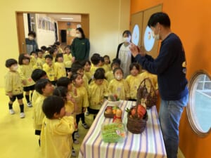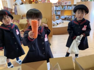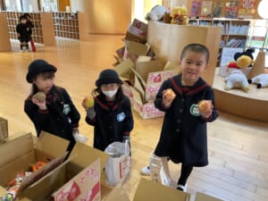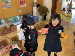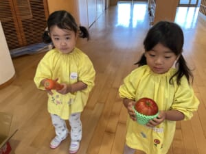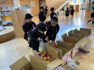 朝、登園して来たら担任の先生に報告して、自分で野菜や果物を箱に入れに来ます。持って来た野菜や果物の名前もきちんと言えていました。