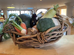 ステージには持ち寄った野菜と年中組の作ったツリーが飾られていました。