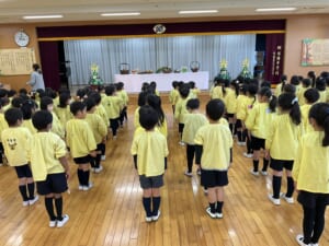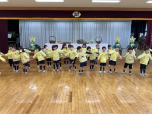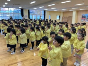 全員で「うれしいかんしゃさい」を歌います。その後、年中組さんが施設訪問のために練習して来た「とんぼのめがね」と「手のひらを太陽に」を振りをつけて披露してくれました。