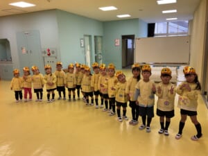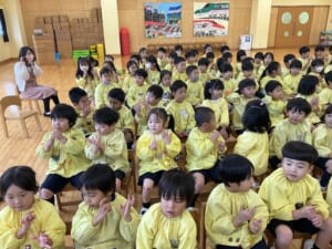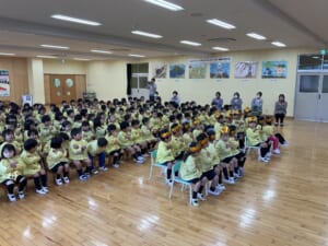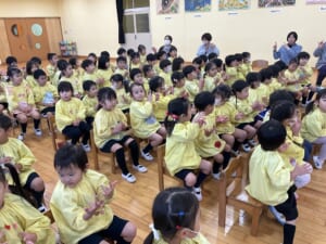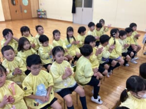 拍手に迎えられて入場です。朝のご挨拶、お祈り、讃美歌のあと今月の歌「山の音楽家」を可愛い振り付けで歌いました。