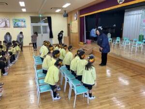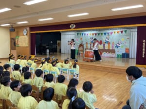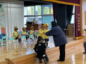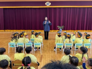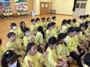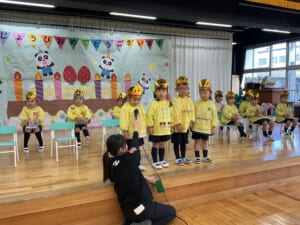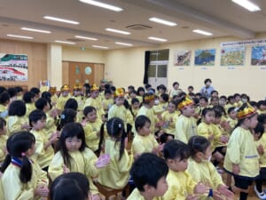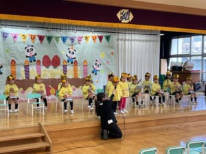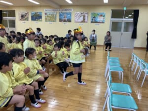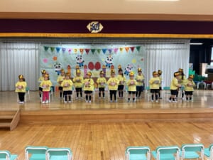 誕生者はステージの上でお名前を披露して、プレゼントを受け取ります。小さい組さんも元気にお名前が言えました。